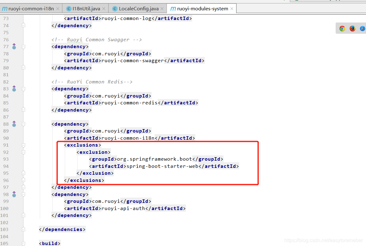 5.system模块引用pom说明,将18n国际化依赖的包排除掉,只是为了看起来更合理点,也可以不排除