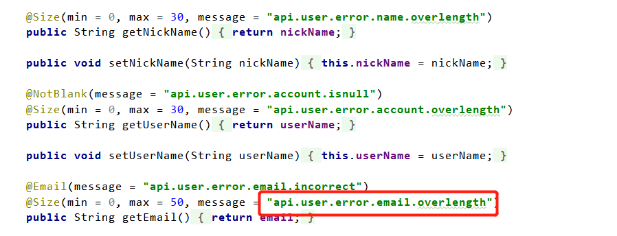 具体调用示例,正常转换只需要调用I18nUtil.getMessage(key)即可。重点说下自定义校验标签,若@NotBlank @Length,因为在国际化包中配置类中在Validator中将国际化注入进去