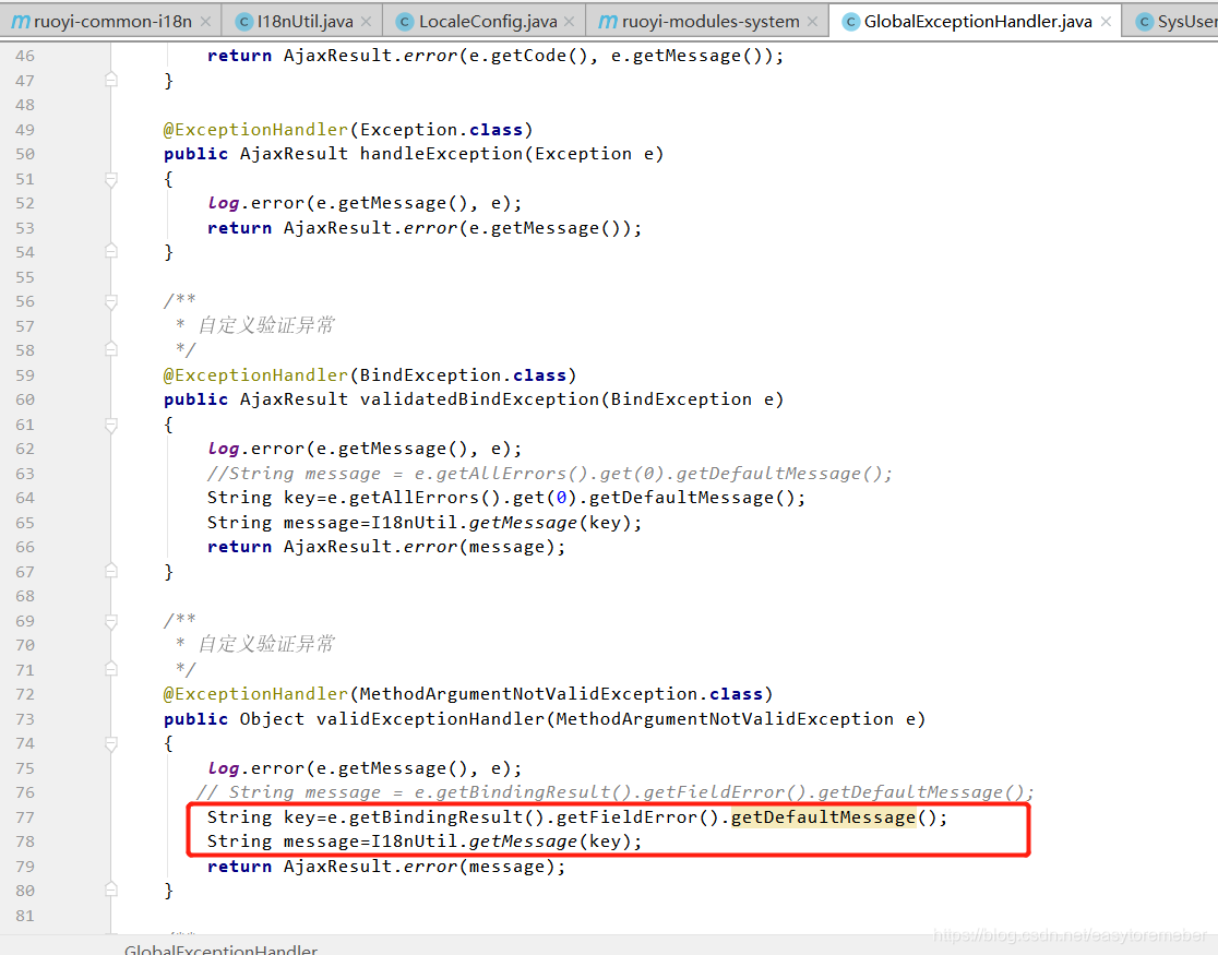 因为ruoyi-system模块中主要校验都是通过GlobalExceptionHandler进行处理,此处讲述如何配置和处理