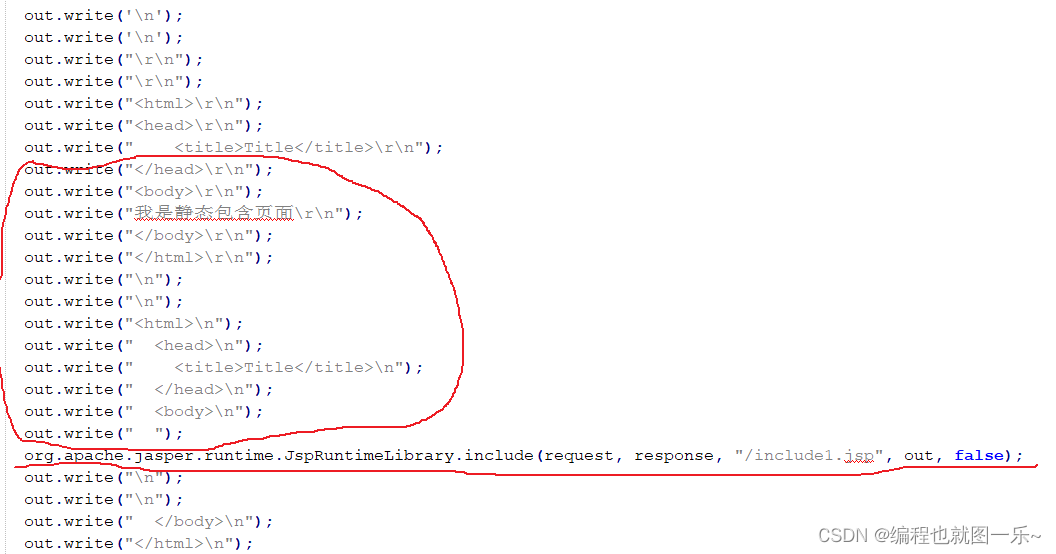 可以看到,静态包含页面的内容是直接翻译在out.write方法中输出的,而动态包含页面则是通过include方法进行调用的。