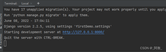 2.运行项目:python manage.py runserver