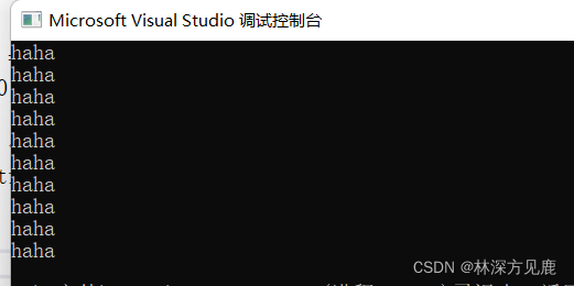 打印结果是10个“haha”,为什么是这个结果呢?我们来分析一下:首先进入外层循环,判断i=0,条件为真,进行内层循环,k=0,判断条件为真,开始打印10个“haha”,然后经过十次循环后,k=10,跳出内层循环,然后进入外层循环,i=1,条件为真,再次进入内层循环,此时k=10,条件为假,跳出循环,之后的9次内层循环都直接跳出,不再进行打印。所以当内层循环少了初始化后,再次进入内层循环之后就不再对内层循环变量进行初始化,就得到了上面的运行结果。