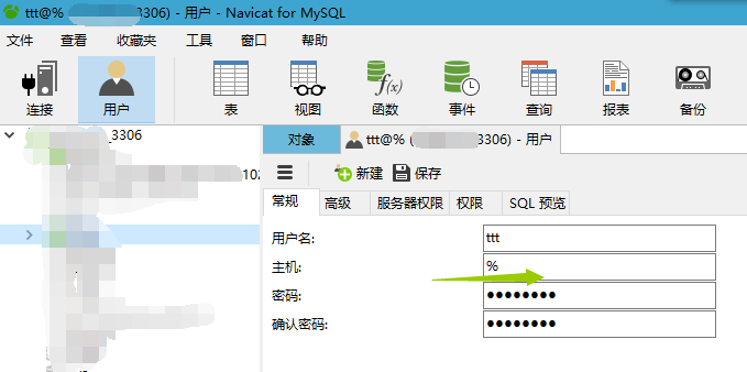新建用户将主机字段改为%,表示任意ip都可通过此用户登录