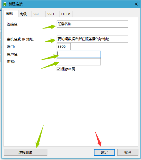 输入要连接服务器的ip地址,用户名密码,一般默认端口3306,连接测试,成功点确定,连接数据库完毕。