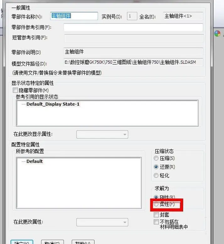 5,打开零部件属性,并点击求解为命令下的,为柔性,点击确定
