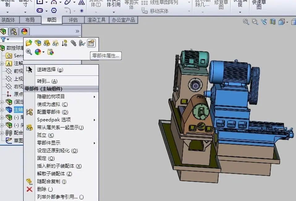 4,现在我们需要让子装配体在总装配体中也能够移动。我们打开总装图,在设计树中选择子装配体,并点击右键,找到零部件属性