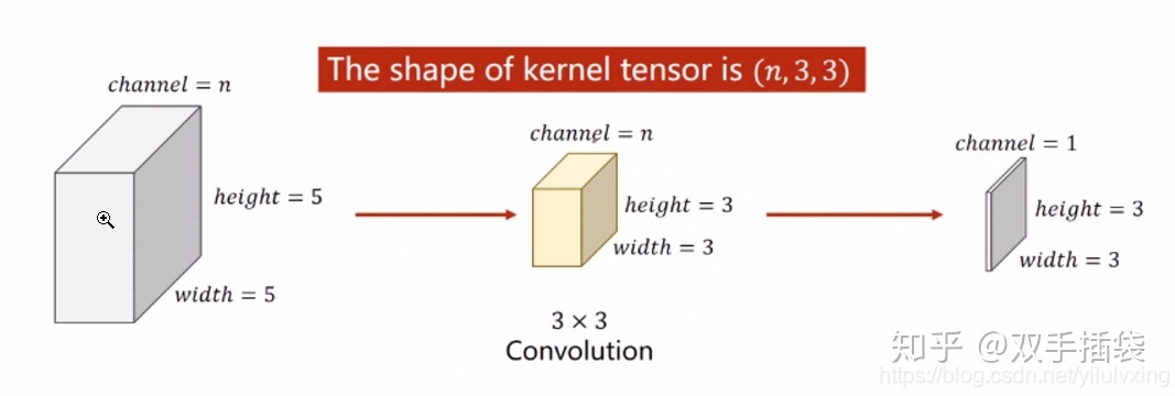 在上面的多通道卷积1中,输出的卷积结果只有1个通道,把整个卷积的整个过程抽象表示,过程如下: