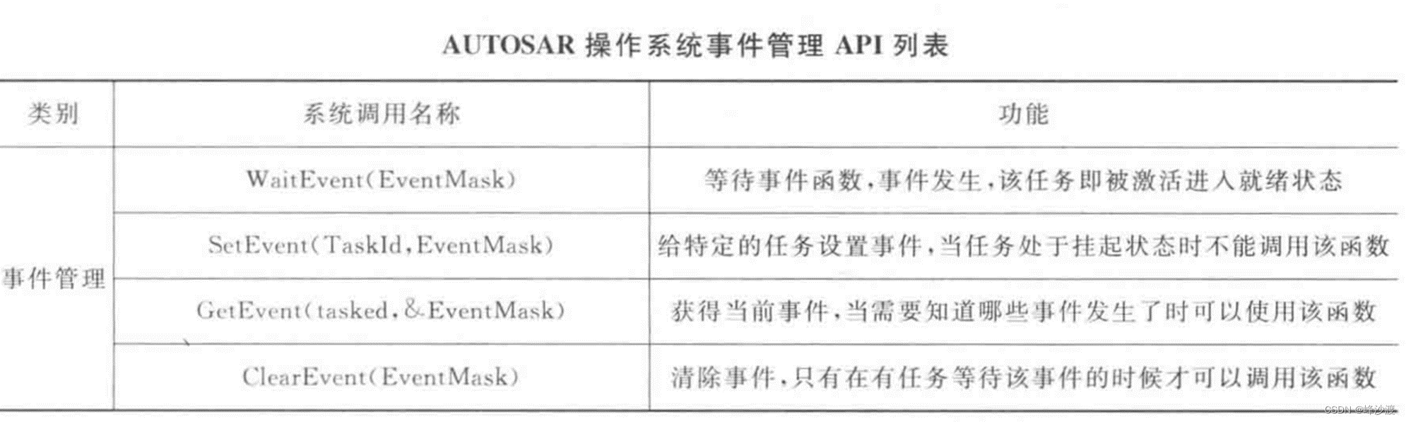AUTOSAR操作系统中针对事件管理的API如下表所示。