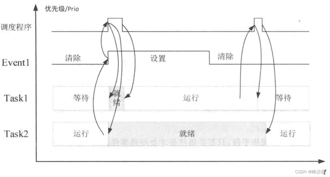 下图展示了两个可抢占扩展任务的事件同步。任务1和任务2均为扩展任务,其中任务2可抢占,任务1的优先级比任务2高。初始任务1由于等待的事件被清除而处于等待的状态,任务2设置了任务1等待的事件后,调度程序被激活,任务1转为就绪状态,由于任务1的优先级比较高,因此任务1获得处理器资源得以运行,任务2 被任务1 抢占而进入就绪状态。随后,任务1清除该事件而进入等待状态,任务2 得以被调度而运行。