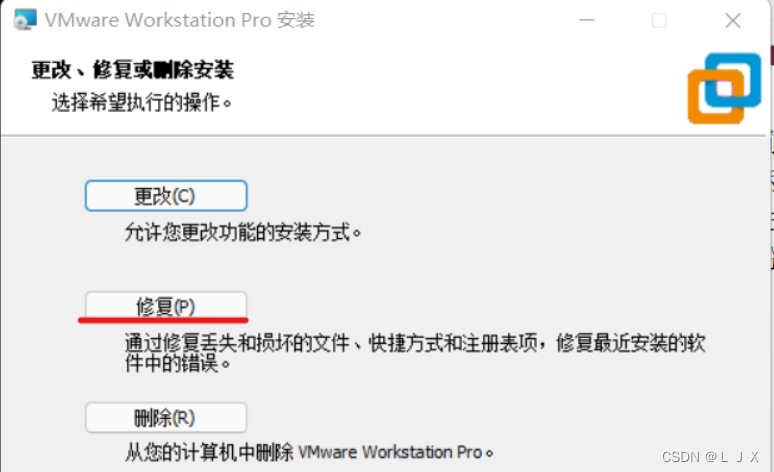 Vmware解决无法识别USB的问题1.找到Vmware安装包,右键点击以管理员身份运行。2.点击修复 3.等待修复完成 4.重启电脑,问题解决。版权声明:本文为aaaaaaaa123345原创文章,遵循CC 4.0 BY-SA版权协议,转载请附上原文出处链接和本声明。原文链接:https://blog.csdn.net/aaaaaaaa123345/article/details/125860379