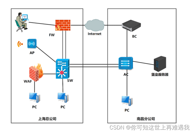 - FW、SW、AC之间配置OSPF,实现ipv4网络互通。要求如下:区域为 0 同时开启基于链路的MD5认证,密钥自定义,传播访问INTERNET 默认路由,分公司内网用户能够与总公司相互访问包含loopback地址;分公司AC和BC之间运行静态路由。