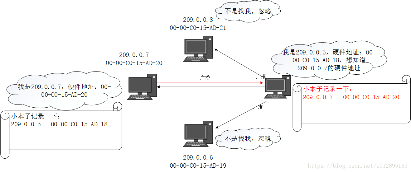 工作原理:A先广播发送请求,B收到后在缓存中写入A的IP地址到硬件地址映射单播响应,然后在A的缓存中写入B的IP地址到硬件地址映射