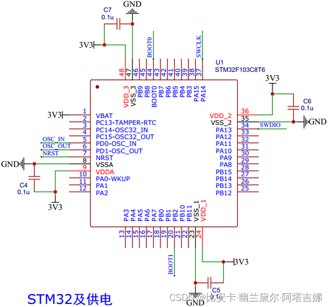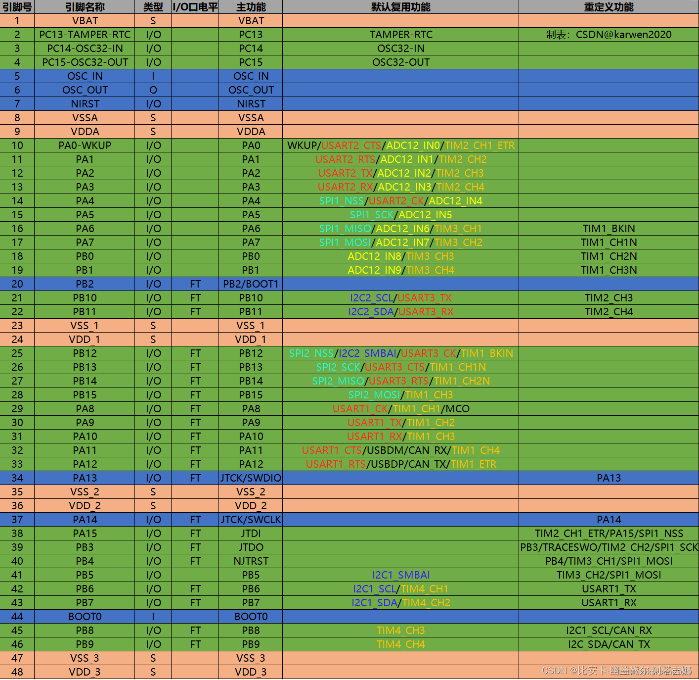红色:电源相关引脚 蓝色:最小系统相关引脚 绿色:IO口、功能口引脚 类型:S-电源引脚 I-输入引脚 I/O-输入输出引脚 电平(最大):FT-5V 无标识-3.3V //STM32采用分区供电,短语口较多 调试方式: SWD:SWDIO和SWCLK JTAG:JTMS、JTCK、JTDI、JTDO、NJTRST //STLINK:SWD方式下载程序