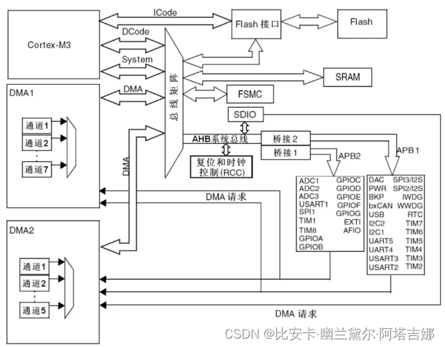DMA:用于数据搬运等,简单且反复要干的事情,DMA通过DMA总线连接到总线矩阵上,拥有总线控制权,访问外设 //需要搬运数据时,外设会通过请求发送DMA请求,DMA获得总线控制权,访问并搬运数据,整个过程不需要CPU参与