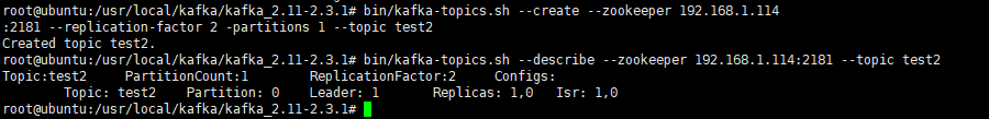bin/kafka-topics.sh --create --zookeeper 192.168.1.114:2181 --replication-factor 2 -partitions 1 --topic test2