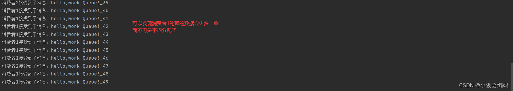 - 下图中搞错了,是两个消费者平摊了50条数据,可以看到按单双消费