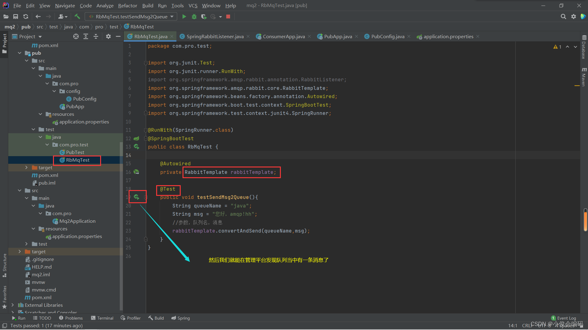 package com.pro; import org.springframework.boot.SpringApplication; import org.springframework.boot.autoconfigure.SpringBootApplication; @SpringBootApplication public class PubApp { public static void main(String[] args) { SpringApplication.run(PubApp.class,args); } }发送者测试类: