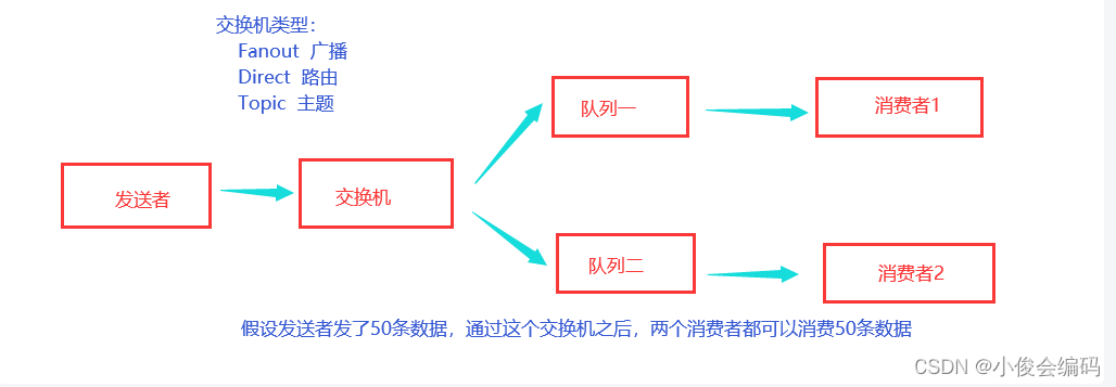 @Test //发送50条消息到Java队列中 public void testSendFanoutExchange() throws InterruptedException { String exchange = "ycznz.fanout"; String msg = "hello,fanout 测试交换机发到两个队列中"; //指定交换机,和指定消息 rabbitTemplate.convertAndSend(exchange, "", msg); }- 可以发现两个消费者都收到了这条消息,这样测试的目的在于知道,通过交换机指定队列,消费者再从队列当中得到消息,两个消费者都是均衡的得到发送者发送的消息