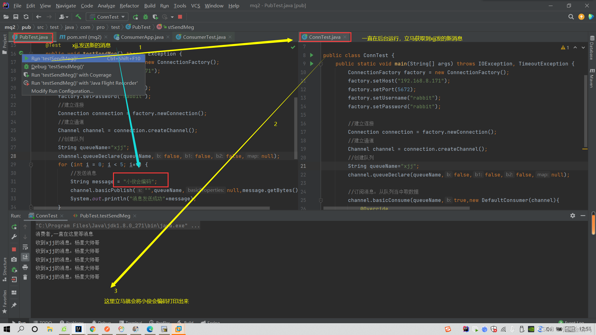 - 如果想实现发送者已发送消息,消费者立马可以看到的效果,就需要写一个测试类ConnTest,来运行刚刚测试类当中的代码,但是需要用到main方法,作为程序运行的主入口,让获取消息队列的消息这个方法一直在后台运行,然后,我们再去发送者模块,发送消息,立马就能获取并打印出来