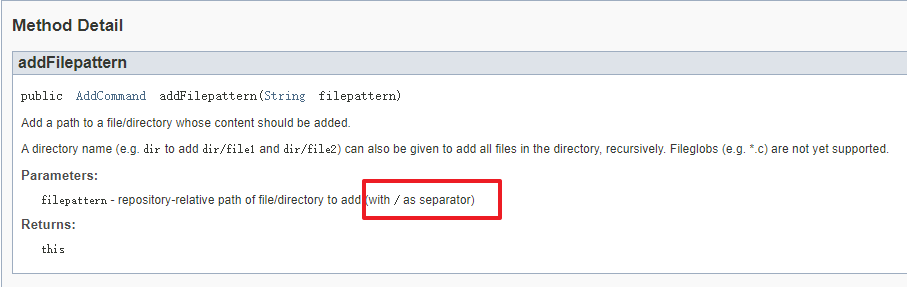 Git.open(gitHome).add().addFilepattern(filePattern).call();- filePattern使用相对路径