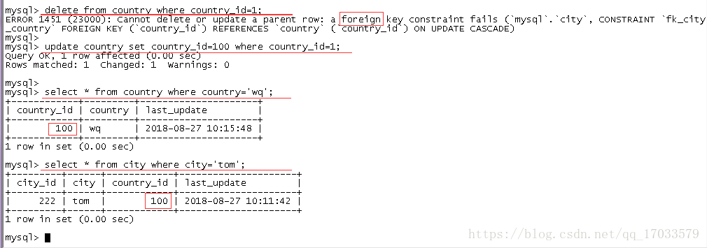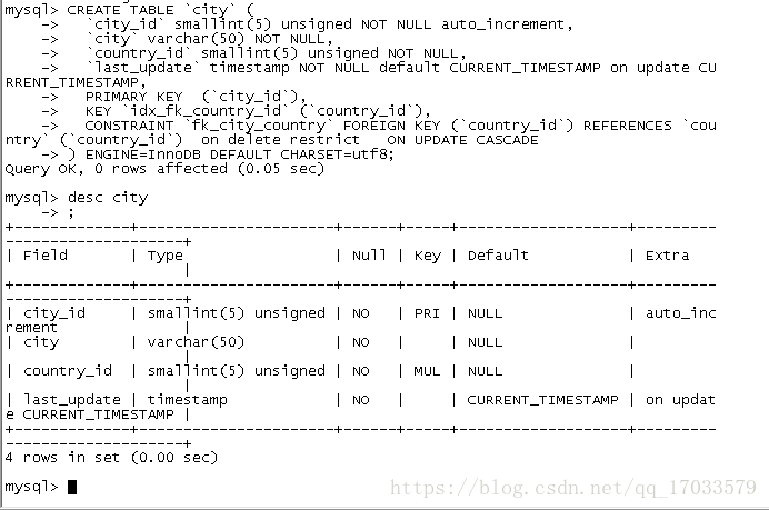 country 表是父表,country_id是主键,city是子表,外键为country_id,和country表的主键country_id对应。