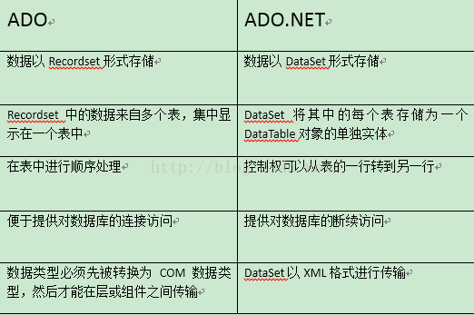 ADO以Recordset存储,而ADO.NET以DataSet存储。Recordset看起来更像单表,如果Recordset以多表的方式表示就必须在SQL中进行多表连接。而DataSet可以是多个表的集合。