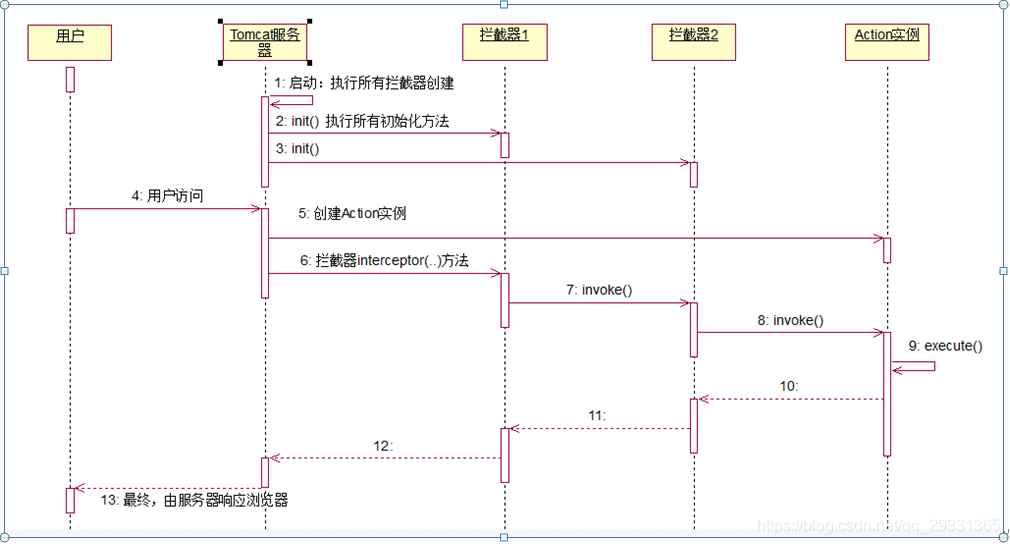 // 访问 action 的时候执行:先创建 action 对象,再执行 拦截器;
