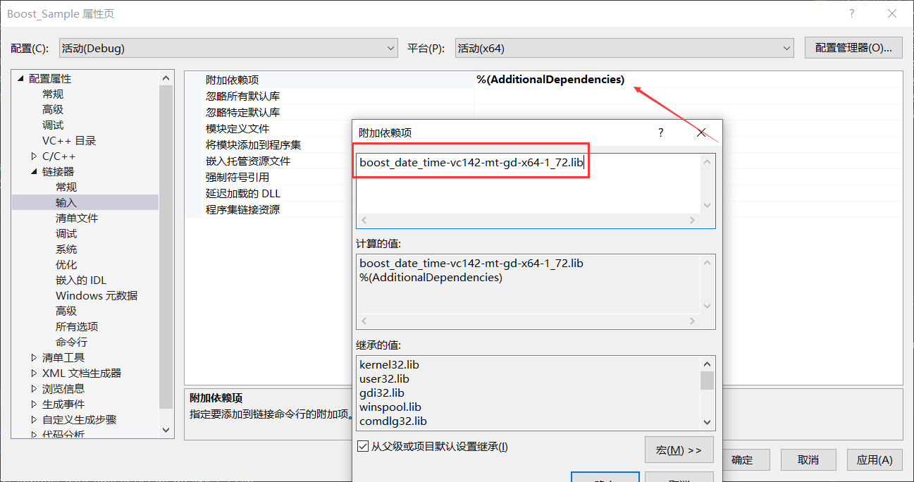 项目属性页面->链接器->输入->延迟加载的DLL 中添加了boost_date_time-vc142-mt-gd-x64-1_72.dll配置文件,总算解决了。