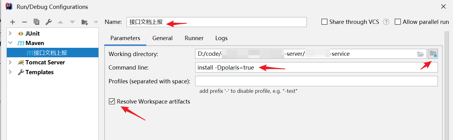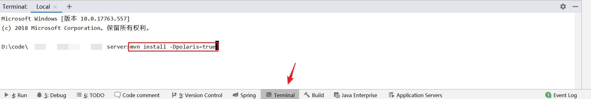 3.3、输入执行的命令,注意mvn是工具自动添加的,直接输入后续命令即可,比如:install -Dpolaris=true