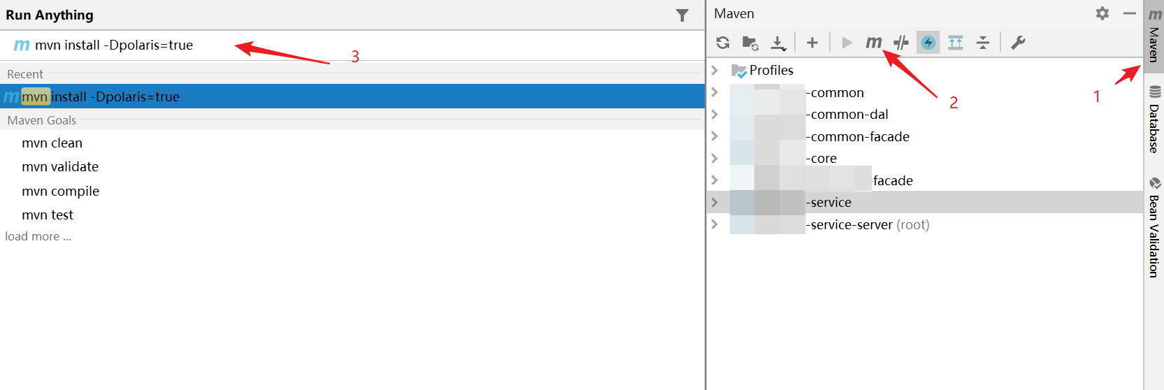 4、在run anything 窗口里面输入我们要执行的命令: mvn install -Dpolaris=true,回车执行即可