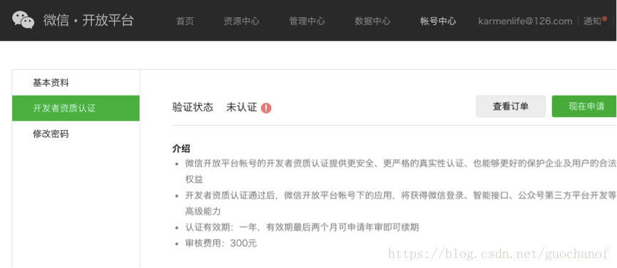 登录微信开放平台(open.weixin.qq.com) – 帐号中心 – 开发者资质认证
