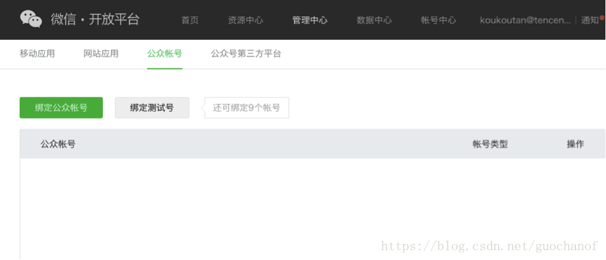 登录微信开放平台(open.weixin.qq.com)—管理中心—公众帐号—绑定公众帐号