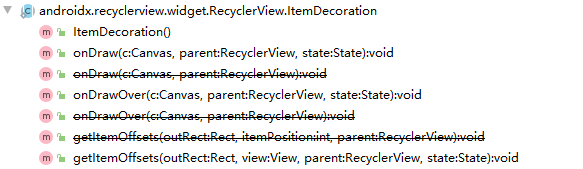编写一个MyDecoration类,继承RecyclerView.ItemDecoration类,Ctrl+O,发现除去已弃用的方法和构造方法,ItemDecoration类主要有三个方法: