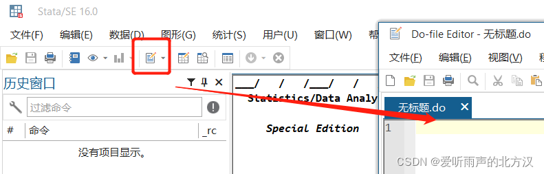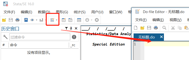 每次操作的代码最好能用stata的do文件编辑器记下。因为记录下以往工作的do文件将便于我们后期重复此类型的数据操作,减少了“重复造轮子”。在stata窗口上部的工具栏中有个孤立的小按钮,把鼠标放上去会出现“bring do-file editor to front”,点击它就会出现do文件编辑器。