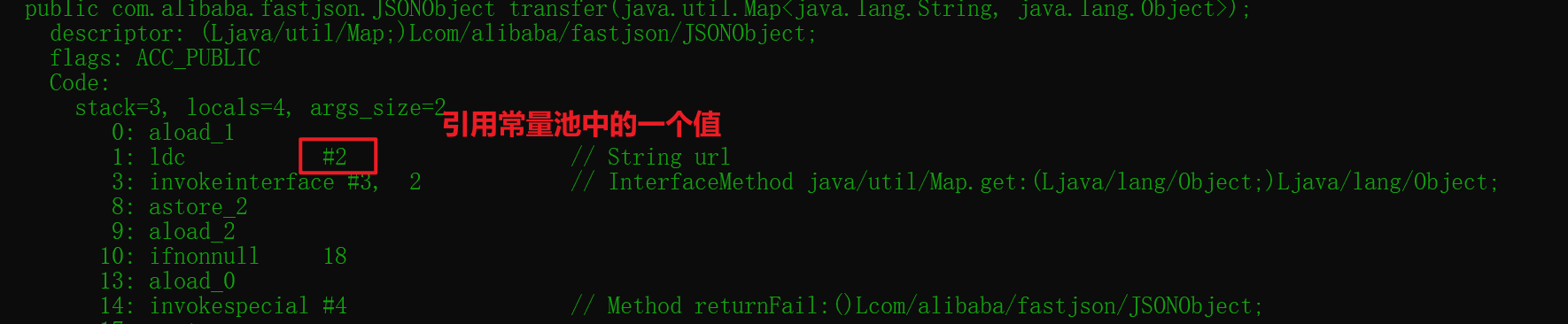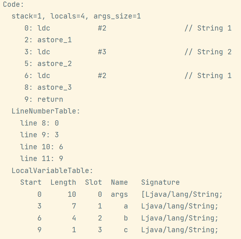 ldc #2会把对应的符号变成一个对象astore_1会将1第个引用类型本地变量推送至栈顶(就是存储到 Slot=1的地方)