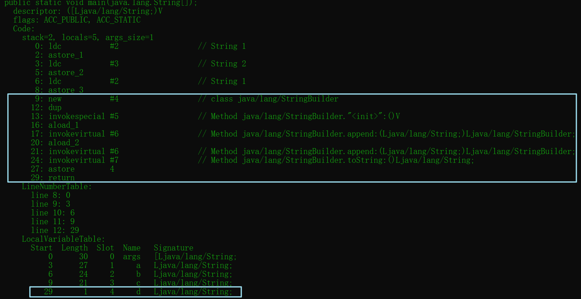 dup,复制栈顶数值并将复制值压入栈顶invokespecial调用实例方法"<init>":()V——StringBuilder的无参构造方法aload_1调用栈帧slot为1的变量(a)的值invokespecial调用实例方法appendaload_2调用栈帧slot为2的变量 (b) 的值invokespecial调用实例方法appendinvokespecial调用实例方法toStringastore 4将toString后的值存入栈帧Slot为4的变量(d)