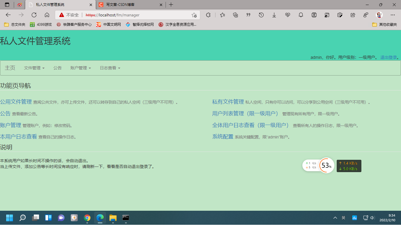这套系统实现的功能有:公有文件和私有文件的存储、相互转换,公告的发布与管理,各级别用户的管理,用户自身的管理,全体或各自用户操作日志的查阅,以及系统配置。