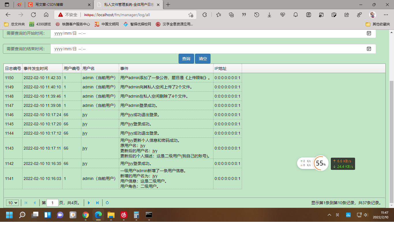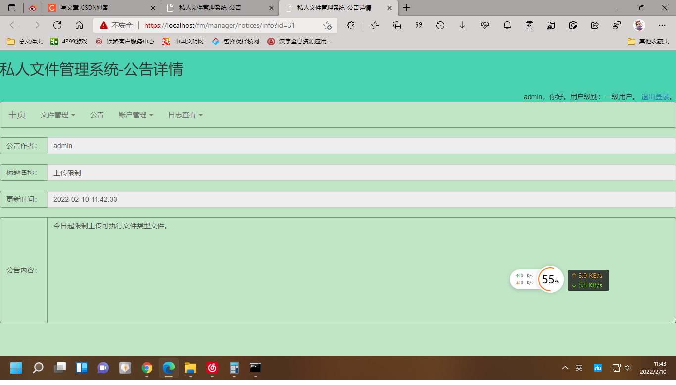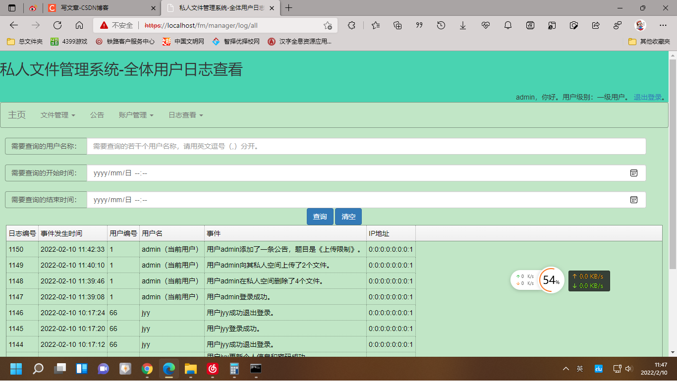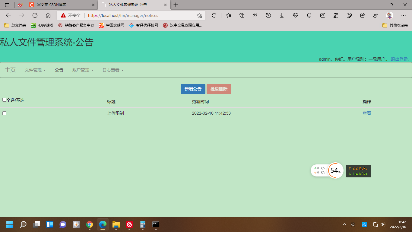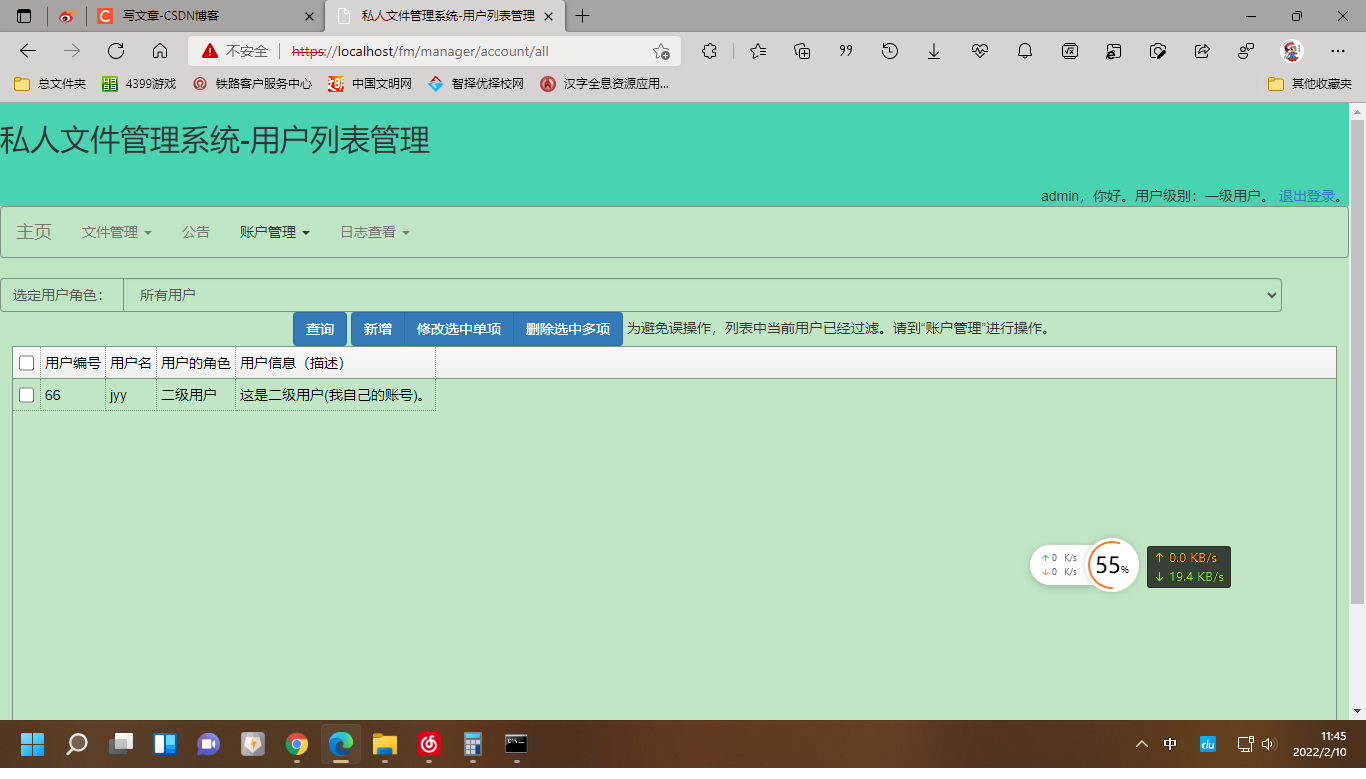 3.二级用户在一级用户的基础上只能查看公告,不能新增公告或删除公告、不能对系统的全体用户进行管理、不能查看全体用户的操作日志;