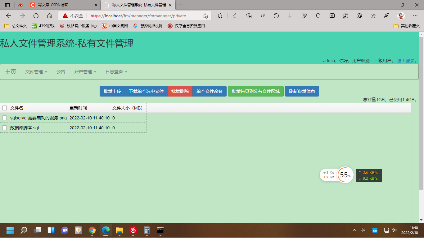 私有文件管理功能:这部分文件仅自己可见,实现文件上传、下载、重命名、删除,转存到公用空间。