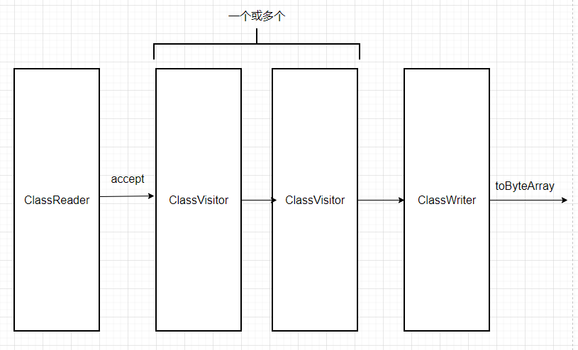 通过继承ClassVisitor,重写visitxxx方法,在方法中对访问到的数据进行操作,然后传给下一个ClassVisitor的子类处理(如果有的话)。经过一个或多个ClassVisitor的访问链处理后,传到ClassWriter手里,由ClassWriter生成最终的字节码结果