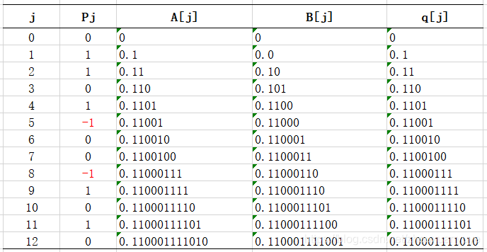 以基2商数集为例,商集为{-1,0,1},r=2,得到的商数P=0.1101-100-11010,将其转换为二进制补码格式,过程如下: