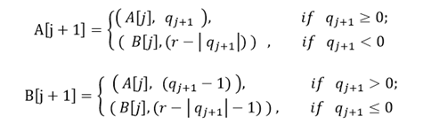 然而,根据QDS函数输出得到转换的结果并不是不可能。所以,应运而生的On-the-Fly Conversion算法可用来避免额外的计算周期,On-the-Fly Conversion算法中文名称翻译为“飞速转换算法”比较多见。飞速转换算法用于SRT算法中的每一个产生的商数,每次迭代产生一个商数,最高位商数最先产生,在整个迭代过程中,Q[j+1]和Q[j+1] – ulp同时产生,并且分别保存至2个寄存器A和B中,第j次迭代结果表示为A[j+1]和B[j+1]。Q[j+1]表示了在选择了QDS函数后二进制格式下的商值。