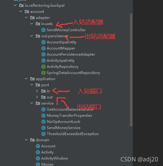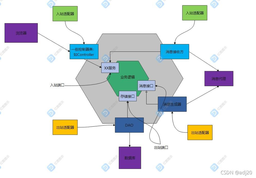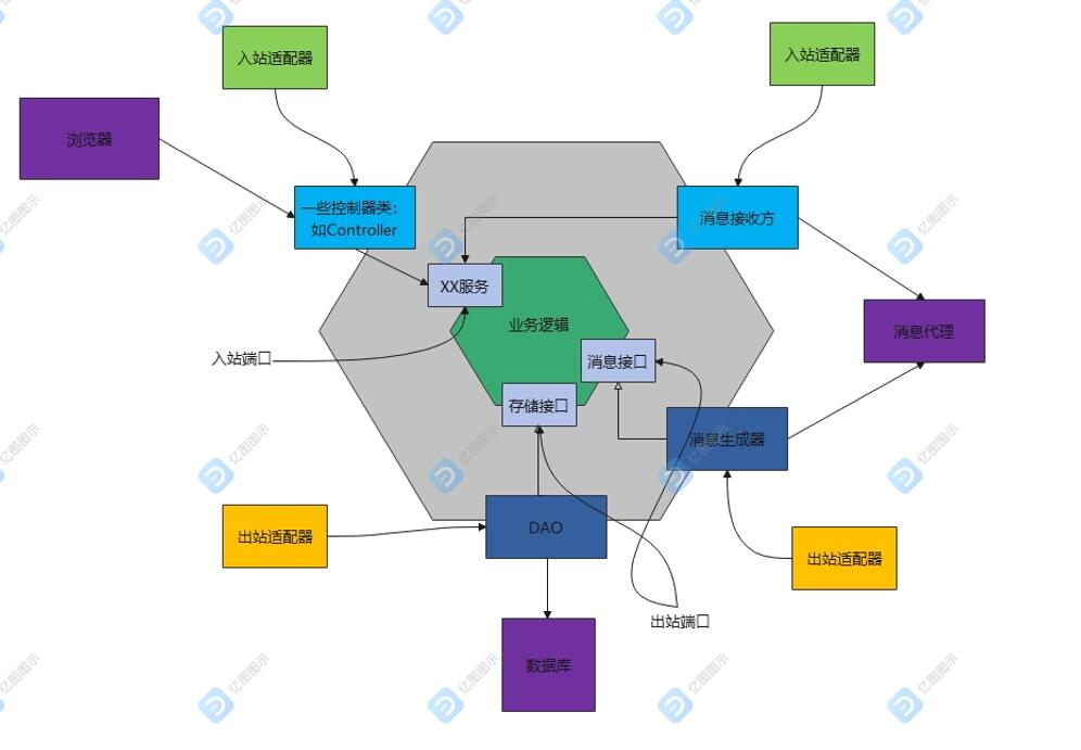 业务逻辑周围有适配器,适配器也包括入站适配器和出站适配器。其中,入站适配器通过调用入站端口来处理外部的请求。我们常见的入站适配器有Spring MVC的controller,消息代理客户端等。特别注意的是,多个入站适配器可以调用相同的入站端口。