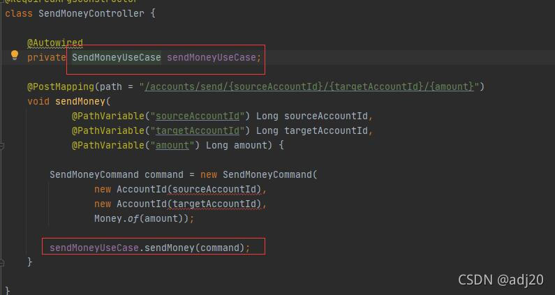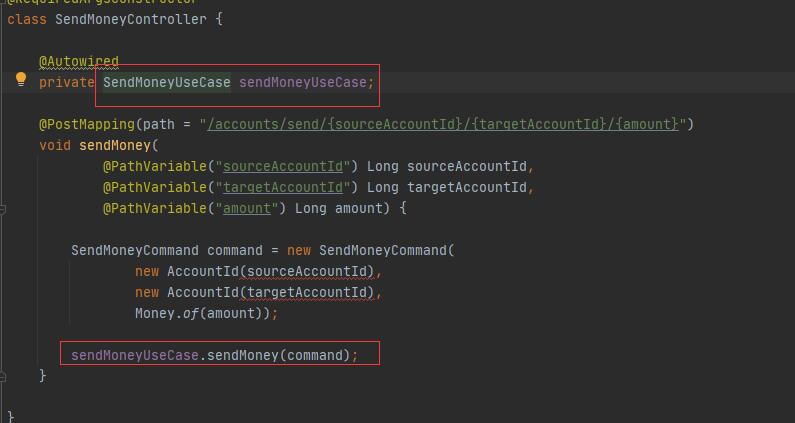 六边形架构的原则是业务逻辑不能依赖与适配器,而是适配器需要依赖与业务逻辑。以入站适配器为例,SendMoneyController作为一个入站适配器,它需要调用入站端口来调用业务逻辑实现具体的请求,这里的入站端口为sendMoney(SendMoneyCommand command)方法,如图4.2所示: