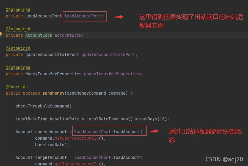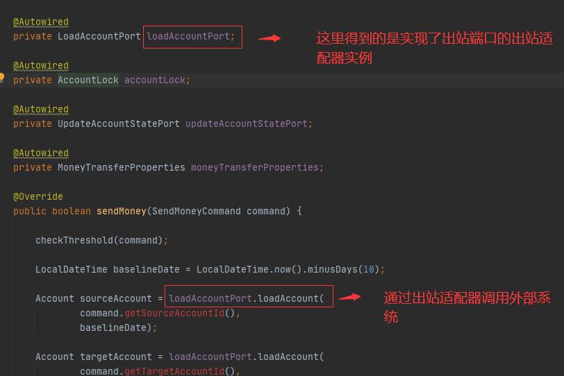 在业务逻辑sendMoney方法中,通过调用实现了出站端口的出站适配器的具体方法在完成业务逻辑对外部系统的调用,如图4.4所示