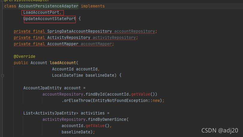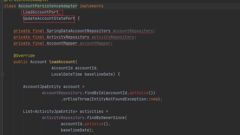 在业务逻辑sendMoney方法中,声明了2个出站端口loadAccountPort和updateAccountStatePort。出站端口LoadAccountPort,UpdateAccountStatePort是两个接口,由对应的出站适配器去实现,出站端口是定义在业务逻辑中的,根据依赖倒置原则,出站适配器必须依赖于对应的出站适配器,进而依赖于业务逻辑,而不是业务逻辑依赖于出站适配器。实现了LoadAccountPort和UpdateAccountStatePort出站端口的出站适配器如图4.3所示: