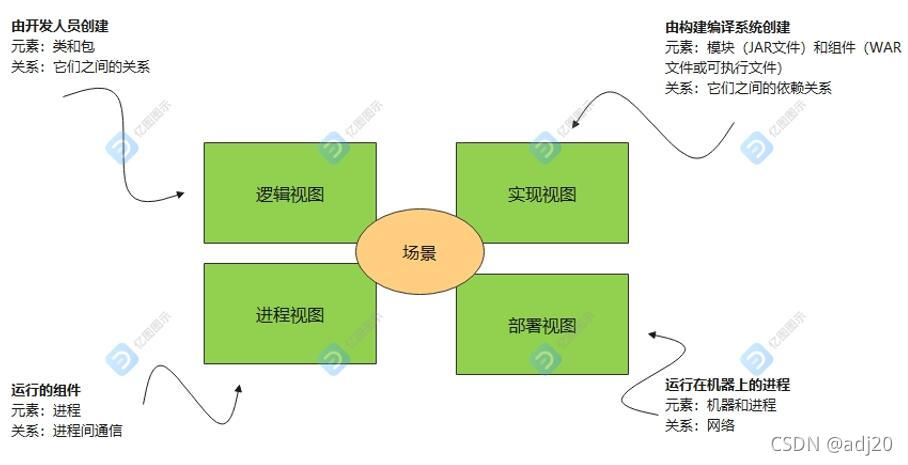 逻辑视图:以面向对象语言为例,元素包括类和包。它们之间的关系可理解为类和包之间的关系(继承、关联和依赖)。