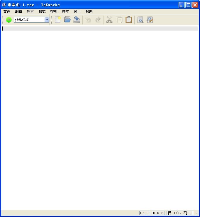 图中空白的部分,就是输入编辑文本的编辑框;在编辑框的右下角,显示有三个按钮,最左边的是换行符模式,中间是编码模式,右边标示当前光标所在位置;编辑框的上方是工具栏,工具栏的右半部分使大家熟悉的功能(新建、打开、保存、撤消、恢复、剪切、复制、黏贴、查找、替换),工具栏的左边则是编译按钮 (TeXworks 也称其为“排版工具”);工具栏在往上,则是菜单栏,此处按下不表。