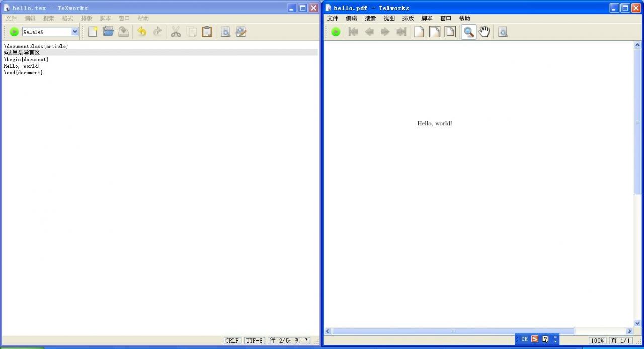 除了 “document” 环境中同时出现了中文和英文,和最原始的 Hello, world! 不同点在于,导言区中多出了两条控制序列。他们的作用我已经用注释标出了。