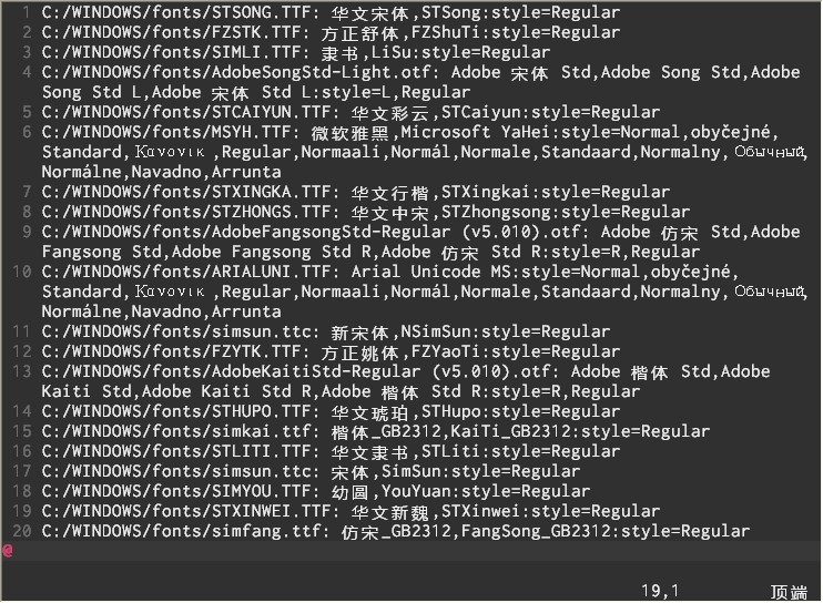 fc-list :lang=zh-cn > C:\font_zh-cn.txt